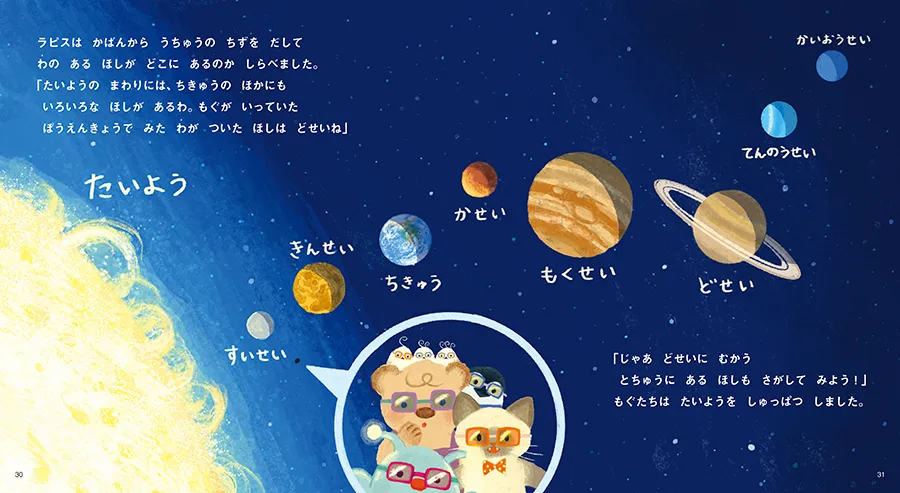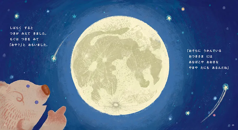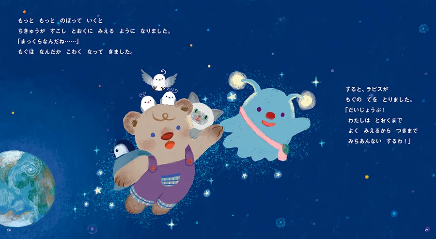 ある日、主人公のこぐまのもぐは、友だちとはぐれて困っている宇宙人のラピスに出会います。ラピスの友だちさがしのお手伝いをすることになったもぐが、なかまたちとともに、宇宙を旅するお話です。人気イラストレーターで絵本作家のおおでゆかこさんが描く美しい宇宙は、大人から子どもまで宇宙のとりこになること、まちがいなしです。お話のアイデアを出す段階から監修の先生とも相談しながら、むずかしい宇宙の専門用語を使わずに、月がどんなところか、どんな惑星があるかといった、いろいろな宇宙のふしぎについて、やさしい文章と絵で楽しく学べるよう工夫してつくりました。すべてひらがなでかかれているので、初めて宇宙にふれる小さなお子さんでも読めます。また、本の最後には子どもの興味を引き出す声かけ例や、大人向けの簡単な解説もついているので、読み聞かせにもぴったりです。ぜひ手にとってみてください。
