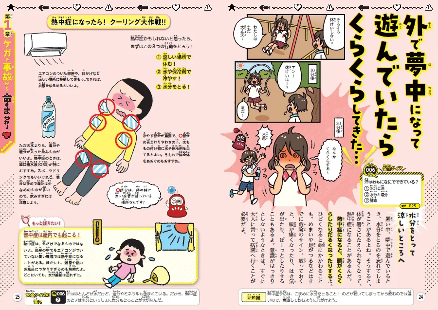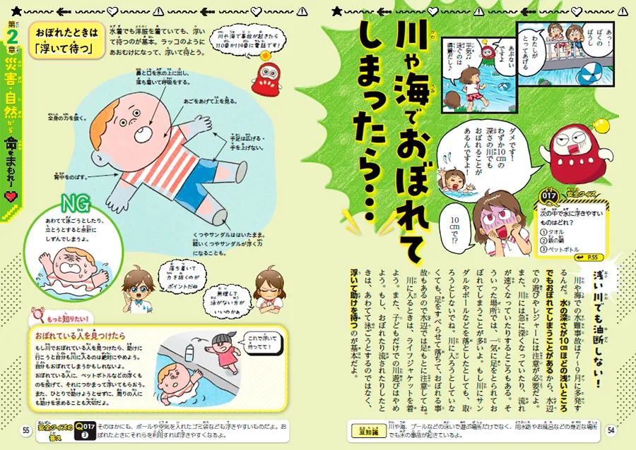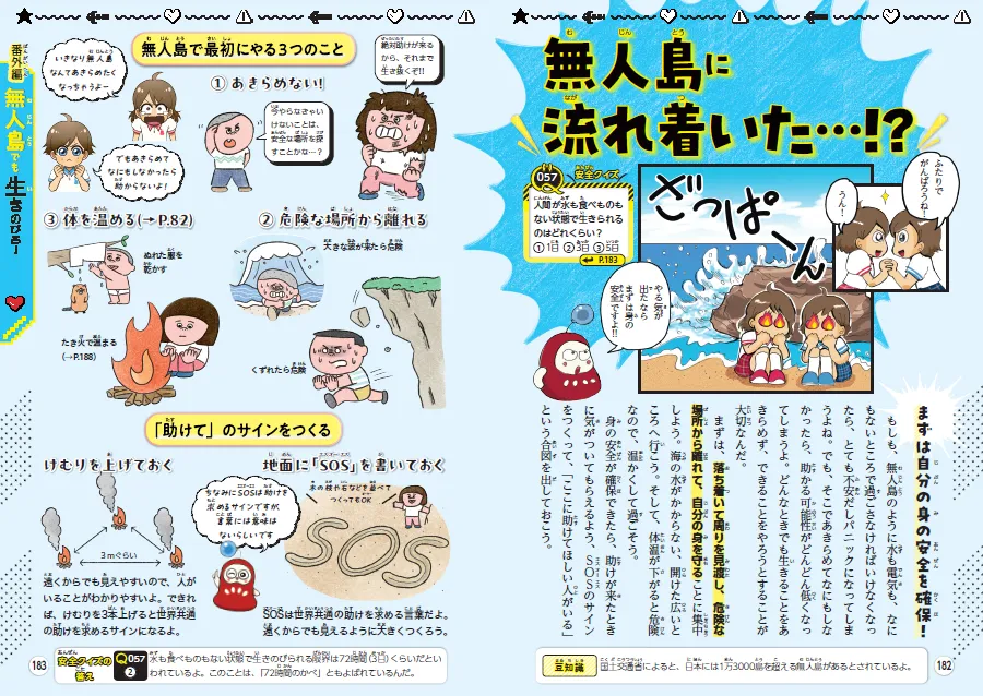 身近なケガや事故、自然災害、事件やSNSトラブル、危険生物……。わたしたちの生活には、いつもさまざまな危険がひそんでいます。この本は、そんな「もしも」のピンチのときにどう行動すればよいのか、命を守る知識をぎゅっとまとめた一冊です。情報量が多い分、むずかしく感じないように誌面構成を工夫。マンガやイラストも豊富にとり入れ、楽しみながら自分の身を守る力を身につけられるようになっています。子どもはもちろん、大人も一緒に読んで学べる内容で、家族みんなの安全を守るために、一家に一冊そなえておきたい本です。