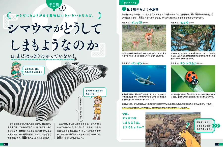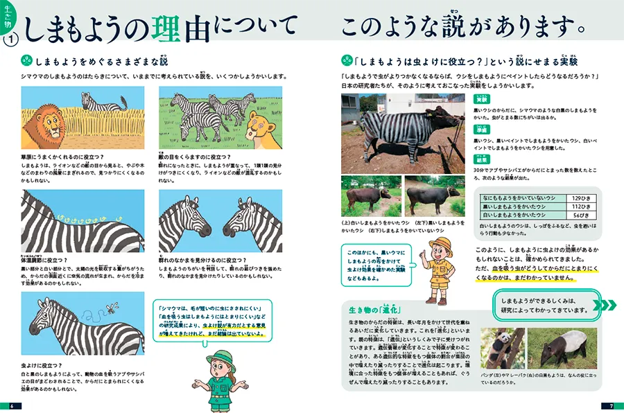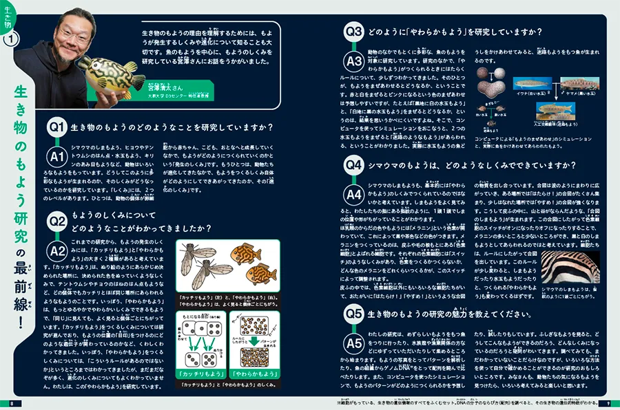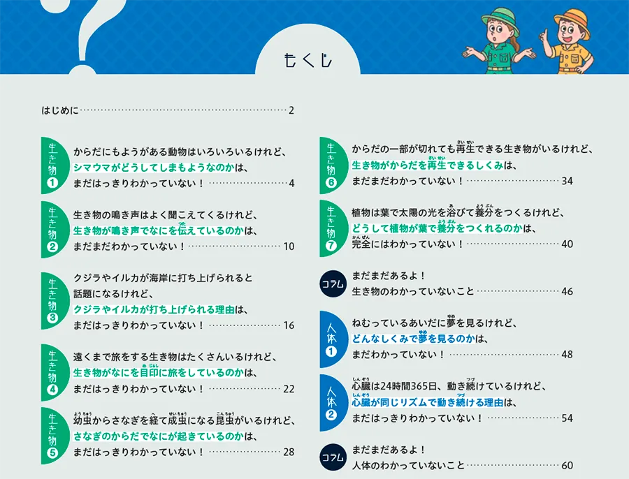 児童向け 図鑑 学校図書館向け わかっていないこと図鑑① 生き物・人体 発行日 2026年2月 出版社 大日本図書 編集のポイント 世の中の「わかっていること」は、数えきれないほどの研究者たちが解明してきたことですが、まだ「わかっていないこと」も身の回りにはたくさんあります。本書は「わかっていないこと」について、身近な疑問を入り口に、「考えるヒント」「いままでにわかってきたこと」「研究者へのインタビュー」の3つの構成で、研究の最前線へとせまっていきます。第1巻「生き物・人体」編で計9名の研究者にお話をうかがったインタビュー記事では、研究方法や研究成果の紹介に加え、予想外の発見など研究過程のおもしろさや、わかっていないことを探求する研究者の熱量も伝えることを意識して編集しました。未来の研究者である子どもたちに、自ら疑問をもち、それを解明していくことのおもしろさを感じてもらえるとうれしいです。 < こんなことが、まだ“わかっていない”> ・シマウマがどうしてしまもようなのか ・さなぎのからだでなにが起きているのか ・どんなしくみで夢を見るのか など 制作実績一覧へ 制作実績一覧へ