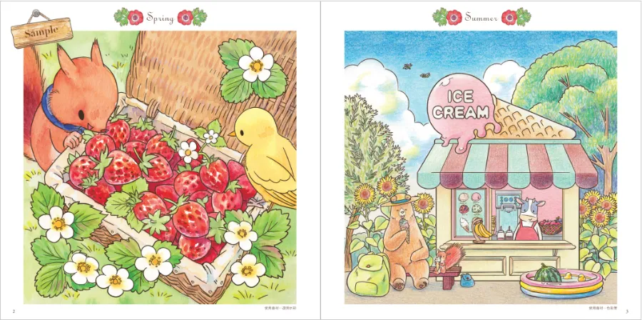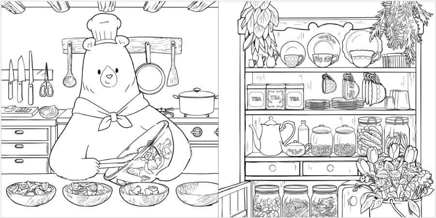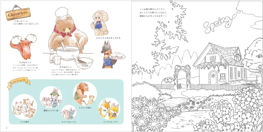 とある森にすむクマのジーノ。彼のレストランでお客さんにふるまう四季折々のメニューが印象的な、ストーリー仕立ての絵本のようなぬりえBOOKです。ぬりえを楽しむ読者の目線に立って、誌面のすみずみまでカラフルに楽しく描けるよう、登場するキャラクターやモチーフ、構図や細かい描写にこだわりました。巻頭では、ぬり見本のほかに、食べ物がおいしそうに見えるぬり方テクニックなども紹介しています。