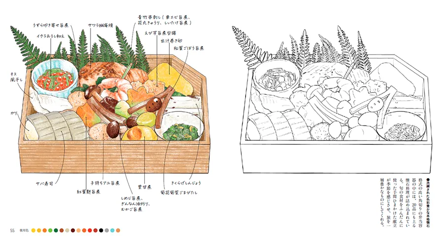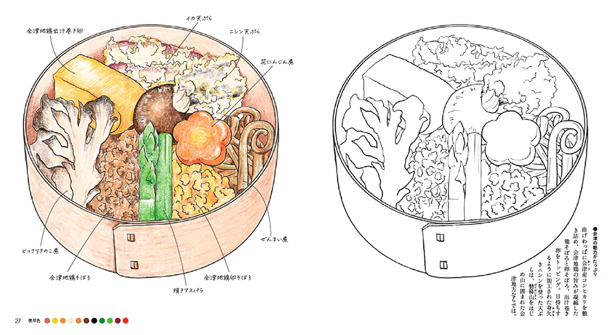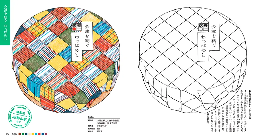 発車時間まで駅弁コーナーを物色。これ、と思う駅弁を手に入れ、車両に乗りこむ。列車が動き出し、おもむろに掛け紙を外すと、目に映るは数々のおかず―。この一連の流れをそのままに、ぬりえの本に仕立てました。駅弁ごとに、まずはパッケージや「掛け紙」のぬりえを掲載。駅弁は掛け紙にも、作り手の思いや趣向が散りばめられています。それは、郷愁を誘う駅周辺の景色、その地が誇る伝統芸能や工芸品、有名作家が描いた絵、コレクションしたくなる容器…、とさまざま。ページをめくれば、いよいよ駅弁の中身が登場。彩りよく詰まったおかずは、もちろん各地の名産品です。食べ物だけでなく、その土地の風物も楽しめる。そんなお得感満載のぬりえの本です。掛け紙やお弁当の解説には、商品の誕生秘話、選びぬいた食材や独自の製法への熱い思いに触れています。ぬりえの合間にお楽しみください。