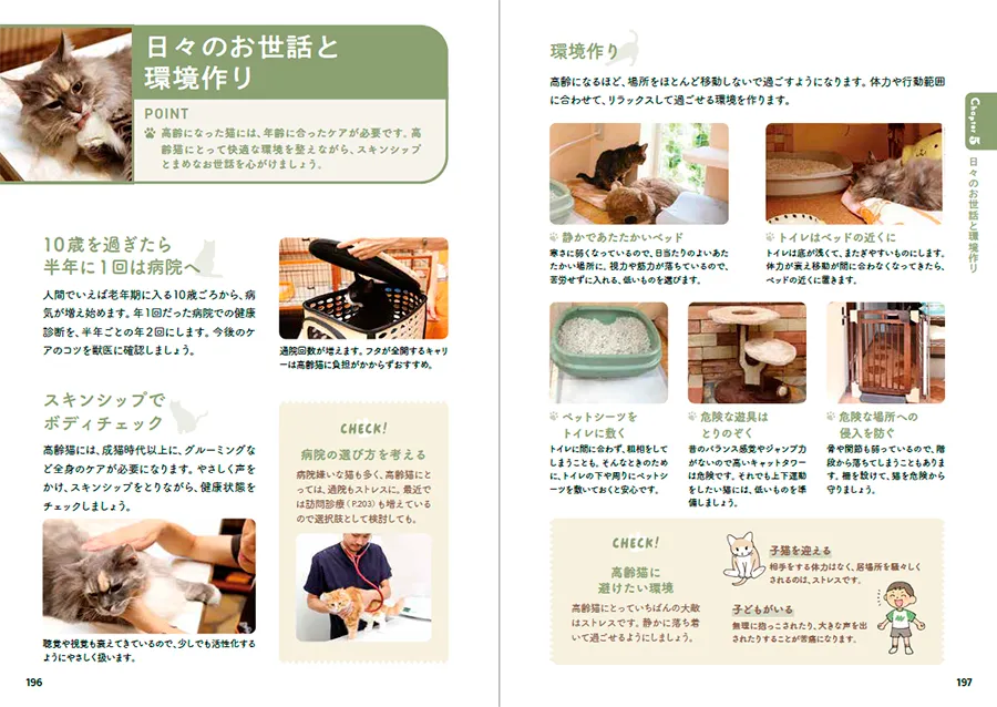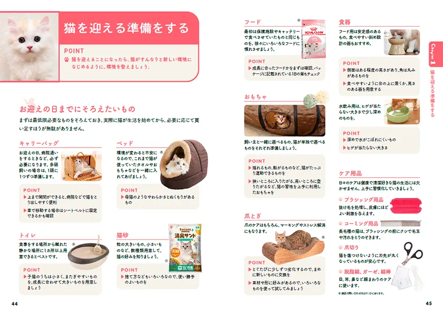 猫を飼ってみたい、でもどこに行けばいいの? どんなお世話グッズが必要なの? 猫とどうコミュニケーションをとったらいいの? 具合が悪そうなときはどうしたらいいの? という、「猫飼いあるある」のお悩みについて、猫を初めてむかえる人に役立つ知識を紹介しました。また、猫との一生にそなえて、高齢猫の介護、飼い主である自分に何かあったときの対処法なども紹介しています。ぜひ、この本をガイドに、猫ライフを楽しんでください。